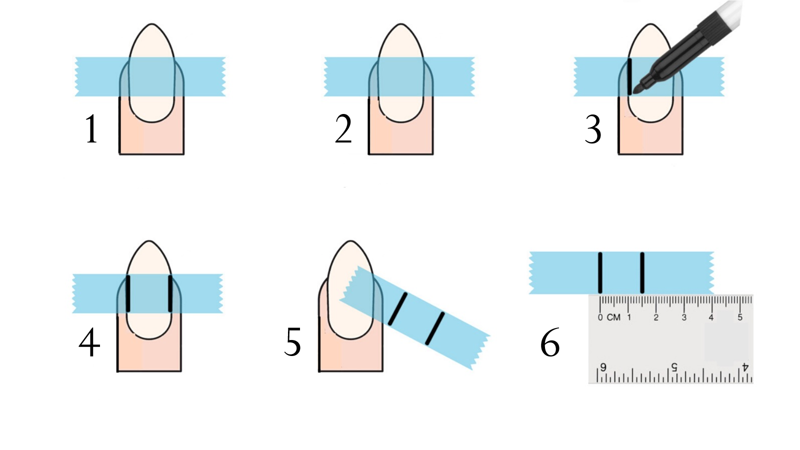 Method two: Apply a piece of clear tape across the widest part of your nail. Use a pen to mark the edge of each sidewall. Remove the tape, place it on a flat surface, and measure the distance between the marks with a ruler in millimeters. Repeat for each nail.